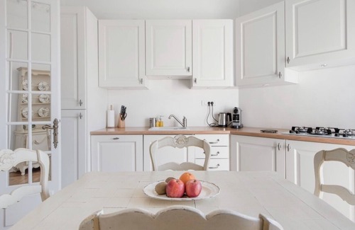 L'appartamento dispone di tre ampie camere da letto doppie e due bagni, ideali per ospitare famiglie o gruppi di amici. Il magnifico camino antico bifronte aggiunge un tocco di calore e raffinatezza, mentre l'aria condizionata garantisce un clima ideale in ogni stagione.