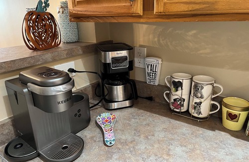 Fully stocked kitchen with electric range/oven, microwave, air fryer, convection oven, waffle iron, panini press, crock pot, Keurig & full size coffee pots, tea kettle, plenty of cookware, grilling supplies for shared grills.