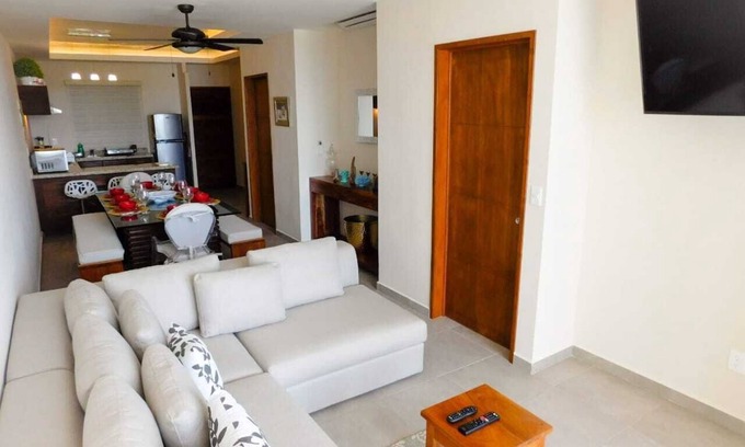 Marvelous & Amazing penthouse, 2 gorgeous bedrooms . Sleep watching the stars with the fabulous sea sounds, 1 King size bed on principal room, 3 single bunk beds on 2nd room and sofa bed to host 8 guests. It also has 2 bathroom and 1 bathtub , AC and kitchenette, equipped with microwave, stove, sink, fridge, coffee maker. The department is part of the Best Hotel in Mahahual called "Aquastar Unic Hotel" and offers cozy common areas, rooftop terrace, 2 swimming pools and sea views to chill.