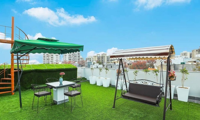 – Private rooftop garden with swing, outdoor dining table with umbrella