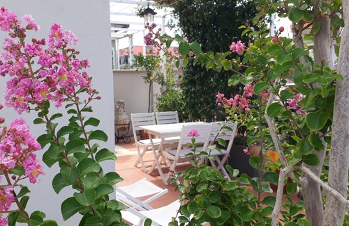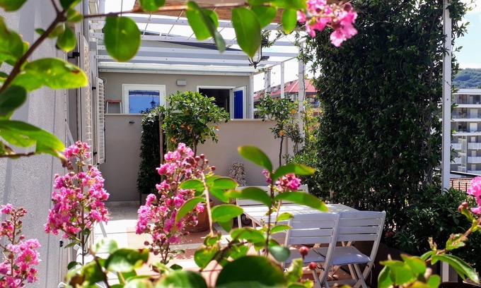It is a bright and sunny apartment with a large terrace full of flowering plants and a shady pergola, on the fifth and top floor of a building in a quiet street.