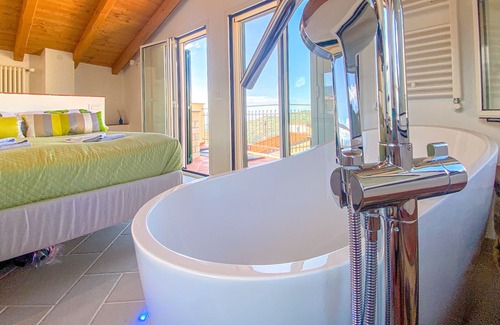 Another staircase leading to the top floor with a luxury double bedroom with free standing bath and double patio doors to the terrace, enjoying stunning views over the valley and the Mediterranean sea glittering on the horizon.