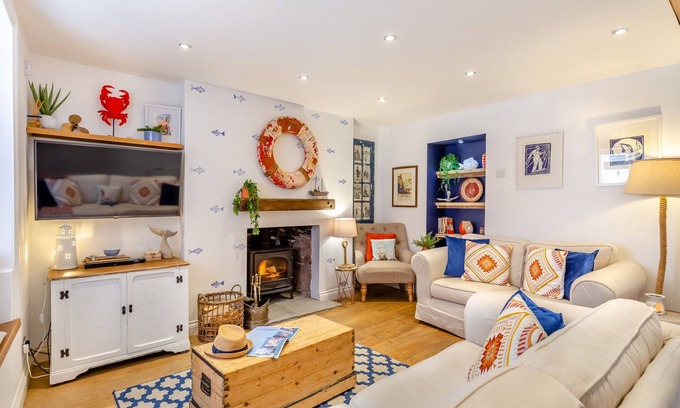 Amenities: Electric thermostatic heaters. Double electric oven, induction hob, microwave, fridge with ice box, washer/dryer, dishwasher, coffee machine and hairdryers. 5 x Smart TV, DVD player, WiFi, selection of books for adults and children, games, puzzles, toys and DVDs. Fuel, power, and starter pack for woodburning stove inc. in rent. Bed linen and towels inc. in rent (please bring own beach towels). Highchair and travel cot available. This house is decorated for Christmas. Parking in nearby public car park. Enclosed rear courtyard with bistro furniture. Two well-behaved dogs welcome - please note pets must not be left unattended. Sorry, no smoking. Shop, pub and beach 0.1 miles. Note: No stag, hen or similar parties. Note: The stairs are steep and narrow where they turn; extra caution should be taken. Note: The second floor bedroom doorways have slightly low head room but fine once your in the room. Note: Between June and the start of September there is a minimum 4 night restriction. Note: the top bunk is only suitable for children. Note: Please enquire about discounts when making a repeat booking. Please note: This property will accept 7 night bookings only, over Christmas and New Year period