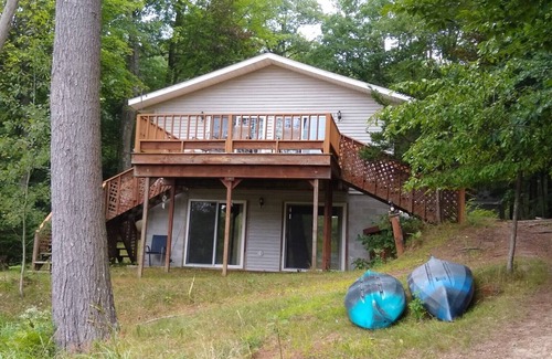 Welcome to Pentwater! Our River House is located just 1 mile to downtown Pentwater. 1.25 miles to Lake Michigan beaches. The recently remodeled two level house features 2 bedrooms with 1- full bath and 1 1/2 bath. This entire house rental is the only direct Pentwater River frontage rental in the area. Updated in 2022 the house will sleep up to 5 guests. You will enjoy a large front/rear yard with a private quite 250 square foot elevated deck overlooking several hundred acres of unobstructed woods. The 1.5 acre wooded property features 300 feet of direct river shoreline/access. We have a large campfire area on the river with an outdoor gas grill. The house has all the kitchen amenities you will need including AC-Wi-Fi , two separate TV's (upper and lower level). River House is located in a wooded low traffic setting perfect for walks and biking. Bring your own Bikes, Kayaks, Canoes and Fishing Poles and plan your water adventure from the back yard on the river. Thank you for choosing our house!! We hope you enjoy your stay.