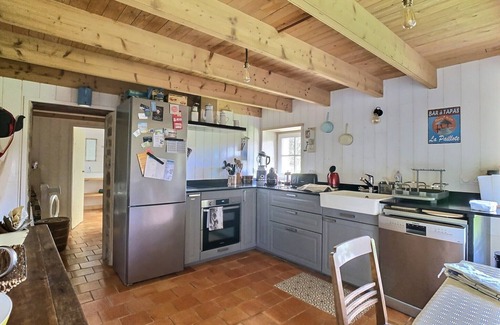 Ground floor: Living room (flat-screen TV, DVD player, wood-burning stove, small library), study area, fully-equipped kitchen (fridge-freezer, induction hob + hood, oven, French press coffee maker, Magimix Nespresso coffee maker, toaster, kettle, dishwasher, 8-seater extendable table), a master suite (double bed 140 x 190, wardrobe) with en-suite shower room (shower, washbasin, electric towel rail), 1 separate WC with washbasin, 2nd shower room (shower, double washbasin, electric towel rail), 2nd separate WC + washbasin.