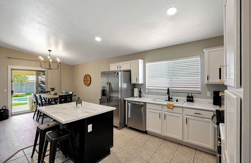 This Peoria paradise offers a vibrant setting for relaxation and fun. Play arcade games, challenge friends at darts, or gather in the open kitchen and living space. Step outside to your backyard oasis with a pool (not heated), BBQ grill, and fire pit for cozy evenings under the stars. Sleeps 6 comfortably with a king, queen, and two twin beds.