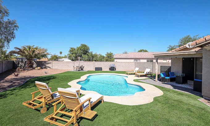 Escape to our Peoria Paradise, a bright 3BR/2BA retreat in Peoria, AZ! Enjoy a sparkling private pool (not heated) fire pit, and fun-filled game area with arcade games and darts. The spacious open-layout kitchen and living room make it perfect for families and groups. Close to the Peoria Sports Complex, shops, and dining—your relaxing Arizona getaway starts here!