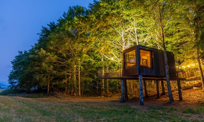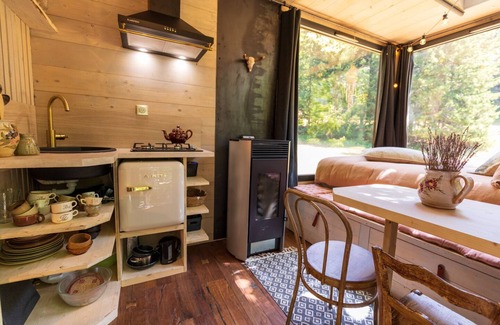 The perched house tree has large windows to become one with the surrounding nature. The windows are equipped with mirror filters to guarantee optimal discretion. Perched in the trees at 3m high, the cabin is equipped with a kitchen, shower, classic toilet, heater, oak parquet floor to bring you maximum comfort and warmth.