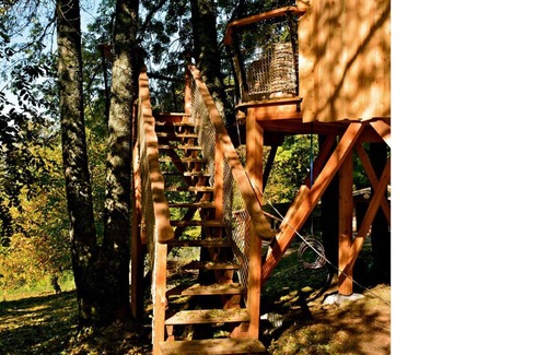 The Pitons cabin is built on a level at 6 meters height; it is accessed by a wooden staircase that takes you to its terrace where warm armchairs invite you to settle for an evening under the trees and stars or enjoy its private jacuzzi. Under the cabin a swing is available.