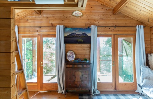 Owl Getaway perches on a mountain ridge, offering stunning vistas of treetops and beautiful songbirds of the forest. Make a cup of coffee just a few feet away from an amazing view. The chalet is a cozy, private hideaway tucked