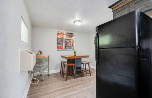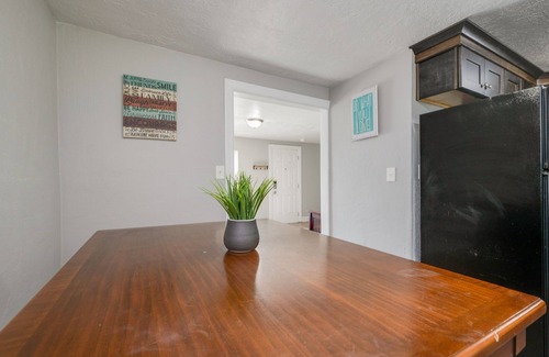 This two-bedroom, one-bathroom duplex offers a comfortable and convenient stay. The entrance is located through the door on the left (as shown in the photo). Enjoy amenities such as a washer, dryer, and a fully equipped kitchen to cater to all your needs. TVs are available in the living room and both bedrooms. The property is situated just four blocks from the beach, at the corner of 4th.