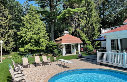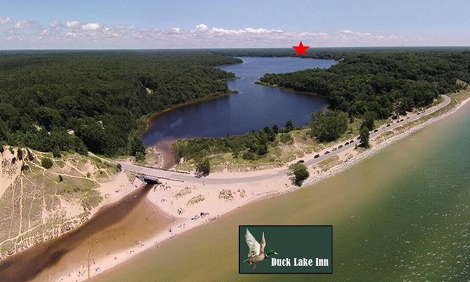 The Duck Lake Inn is the perfect beach house vacation home in western Michigan for entertaining or hosting that family reunion. The cottage features towering spruce trees lining the gated entrance to over 2 acres of beautifully landscaped lawn and gardens. The kitchen and living room of the cottage overlook the tennis court and pool with a sweeping view thru the forest to the lawn leading to your private beach and dock on Duck Lake. www.ducklakeinn.org