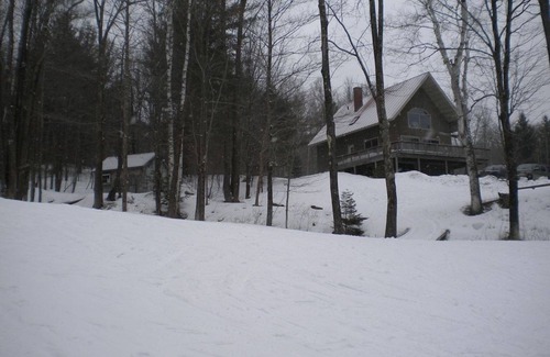 Hillside chalet with brook and large wraparound deck on acreage flanked by state forest. Mountain view, brook sounds, highly visible Vermont moon, hiking trails to Long Mountain. Open plan features enchanting kitchen design and appointments, cathedral ceiling of tongue & groove pine, loft with foldout day bed. WiFi connects you to fiber internet. Suite on upper level has king bed and large walk-in closet, large whirlpool bath with skylight, washer & dryer. Second bath is located on the main floor with 2 bedrooms. Walk out basement has its own living area with a good quality fold out queen and the third full bath. Main level contains family room and dining area. The large kitchen has an island that has 4 chair stools in addition to 6 to 8 chairs at dining table. 20 minutes to Killington Skyeship, 20 minutes to Woodstock Green, 45 minutes to Dartmouth. Sorry, no pets. ***Note: In winter, Vermont roads need all-wheel drive or at very least good tires.***
