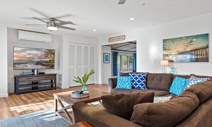 The spacious living room has a large screen TV with high-speed internet providing the ability to connect to Netflix, Hulu or other apps. It also has high-speed ceiling fans and a split air conditioner to ensure your comfort during the heat of the day. Another bonus is a connecting game/dining room with a large table perfect for puzzles or games that is decorated with a stunning traditional Hawaiian ceiling.