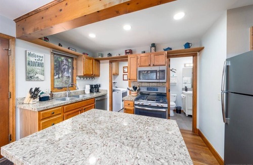 Inside Still Waters Lodge, you'll discover tasteful furnishings and a well-equipped space designed to make your stay both relaxing and enjoyable. The first floor features a newly remodeled master bedroom (queen bed) with a full bathroom, while the second floor accommodates two bedrooms that share a bathroom. One of the upstairs bedrooms boasts a queen bed, while the other serves as a fun bunk room with a queen bed and a twin bunk above. Each bedroom offers its own closet for your convenience. The great room showcases brand new furniture, including two sofas, a swivel chair, and a large ottoman—an ideal spot for games and gatherings around the charming gas fireplace. The fully equipped kitchen invites culinary adventures, while the complete laundry room with a spacious washer and dryer ensures your convenience. Step out onto the deck, fire up the gas BBQ pit, and marvel at the breathtaking views while you relax with a good book or observe the local wildlife.