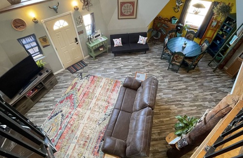 The upstairs loft has a king size bed and with a unique view out the large window. There is also a half bath.