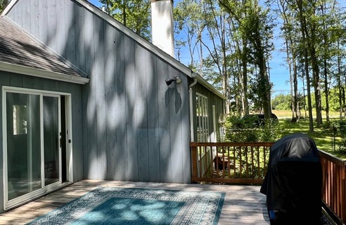 The versatile floor plan makes Strawberry Run an ideal lodging option for the Princeton area. The house has two very large gathering rooms with new furniture, both of which feature large working fireplaces for the cooler months. The "keeping room" off the kitchen is perfect for informal dining, watching television or playing board or electronic games in front of a roaring fire on chilly nights. In the spring, summer and autumn this room is contiguous to a massive 2000 square foot deck embracing the forest in the back. This deck has a grill, outdoor dining area and outdoor seating allowing visitors to sit back and take in nature. The fenced in yard keeps the wild life at bay and offers a safe space for children or you canine companion. The huge casual living room has two large down filled couches and a Steinway B grand piano, a perfect place to relax, watch television, listen to music or play the piano. Also, on the entry level are a more formal dining room with glass doors for privacy which can be used either for dining or as a private conference room and an additional bedroom configured as a reading room with yet another working fireplace.