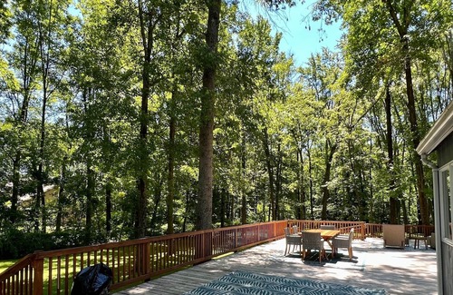 The home itself is a hallmark of living freely. Its spacious rooms make the most of the wooded views and natural light that streams in through the large windows, and the expansive 2000 square foot outside deck wrapping around the kitchen and family room offer outdoor living with a view of a natural forest in the spring, summer and fall months. The house is perfect for everyone with larger common areas for small groups to very private nooks and crannies where tasks requiring quiet can easily be completed.