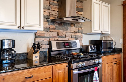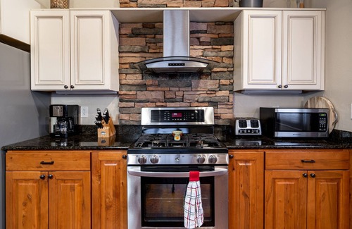 Interior is a blend of modern/rustic, with a modern kitchen, stainless appliances and granite countertops. Kitchen has everything you need for delicious home cooking, plenty of space, and a conversation-friendly breakfast bar. The dining table area comfortably seats 6 or more guests.