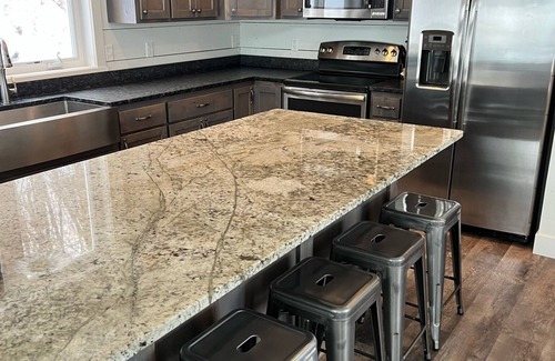 Fully Equipped Kitchen: Enjoy meal preparations and gatherings in a large open kitchen and living area, complete with modern appliances where you can create memorable dining experiences during your stay.