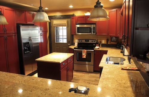 Ours is a single-level house with vaulted ceilings and a finished basement. There is now a ramp for easy accessibility. Amenities include internet WiFi access, streaming netflixs etc.. TV, an indoor jacuzzi in the master bedroom, air conditioning, a pool table, Foosball table, wood-burning chiminea, propane barbecue, a large yard and sheltered patio area, and plenty of space for parking your RV or trailers.