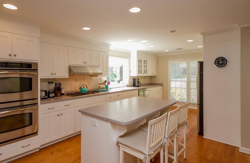 This Kitchen feels Refreshingly Open and Airy thanks to White Cabinets & Gray Corian, Stainless Appliances, Bosch Dishwasher, French Door Refrigerator, 5-Gas Burner Cooktop & Vent Hood, GE Profile Double Wall Ovens & Microwave, Island with Bar Stool Seating, Wine Storage & Open to Breakfast Area.