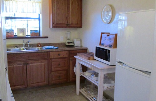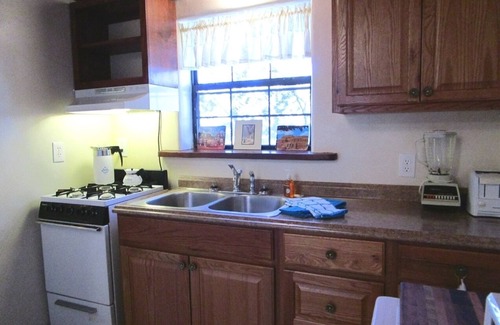 Welcome to this roomy and thoughtfully designed studio apartment, perfect for a relaxing stay in Santa Fe. With easy access to local attractions, this charming retreat comfortably sleeps two and offers a cozy blend of comfort and convenience. Queen-size bed with quality cotton linens for a restful night's sleep. Tile floors throughout, adding to the Southwestern charm. The kitchenette is well-equipped with a refrigerator/freezer, apartment sized four-burner gas stove with an oven, and a microwave. It also includes all the essentials for meal preparation, including a coffee maker, grinder, toaster, and more. Dining table for two, ideal for meals or morning coffee. Taos-style couch, two side chairs, and a small desk, providing both comfort and workspace. Gas fireplace in the living room, perfect for cozy evening. Wi-Fi and a smart TV with Roku and Dish Network for entertainment. Central heating and ceiling fans in the bedroom and living area for added comfort (no air conditioning). Personal porch with a small table for two and a bench, perfect for enjoying morning coffee, reading, or unwinding. You may also enjoy the common area front patio with banco seating and a table with 4 chairs offering a peaceful spot to sip coffee and soak in the atmosphere.
