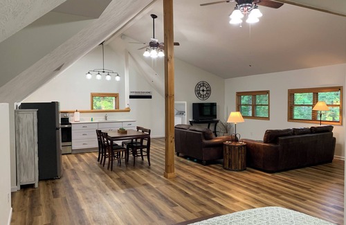 This large studio apartment is above a three-car garage on five acres of a wooded hillside.