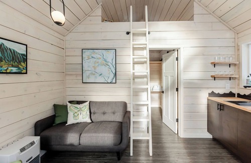 Deluxe Micro Cabins are perfect for your special trip to Alaska and just big enough for 2. This dog-friendly cabin feature a living room with petite couch, chair and Murphy table. A kitchenette completely outfitted for your travel cooking needs with silverware, pots & pans, culinary tools, basic spices and of course, in-cabin coffee maker. Stovetop burners, microwave and mini fridge are also available to cook up whatever you need. Bathroom includes a shower, toilet & sink. Finally, the bedroom has a queen bed with built in closet space and a loft to curl up with a good book.