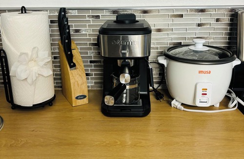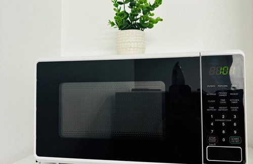 The suite's entrance is completely private and separate. Complimentary parking is available on the right side of the driveway, with high-quality surveillance ensuring the safety of your vehicle and the walkways. The suite is situated in a serene and secure neighborhood. The unit features a kitchen equipped with all the essential amenities for your stay, whether you wish to prepare a meal or enjoy a bottle of wine. (A comprehensive list is available upon request.) The suite includes a private, full bathroom with shampoo, soap, conditioner, toilet paper, a hairdryer, and towels. Additionally, enjoy a movie in front of an electric fireplace while watching a movie or show on the TV with complimentary access to Disney+, Hulu, ESPN+, and Netflix, as well as 5G Wi-Fi for your personal devices. Finally, enjoy a restful night's sleep on a comfortable king-sized bed.
