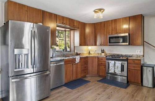 Escape to this superb house in picturesque New Castle. With 6 bedrooms including 1 king, 2 twin, and 3 queen beds, this tranquil retreat offers plenty of space for guests to unwind. Enjoy the tremendous amenities like a massive deck with amazing view, music studio, laundry/fitness room, jetted bathtub, large board game selection, and two cozy living rooms (one with a futon). We look forward to hosting you at our place.