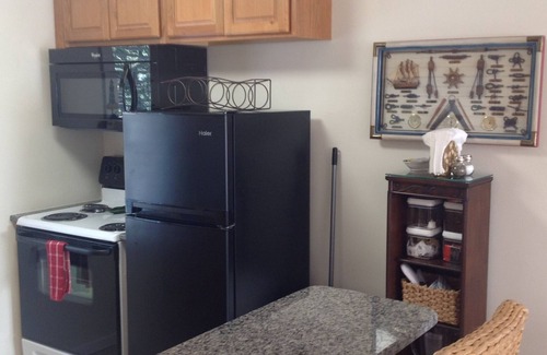 The full bath has a shower and tub combination. Your kitchen is fully equipped with electric stove, dishwasher, medium refrigerator, full size microwave, blender, toaster, and coffee pot. There are also essentials for cooking and dining. A shared washer and dryer is located on the first floor as well and all detergents are provided.