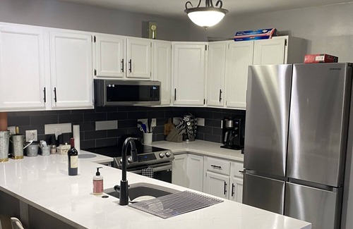 Full kitchen, grill, washer/dryer, WiFi, cable, jet tub in master bathroom, pets are welcome, and off-street parking available.