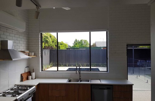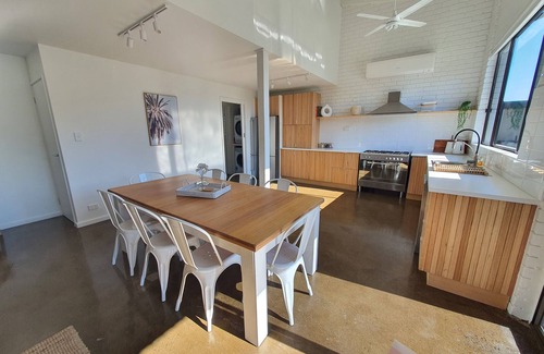 The accommodation boasts a spacious loft designed for gatherings, with double height ceilings and an open plan layout that seamlessly connects the living, dining, and kitchen areas. The dining table expands to cater to larger groups, perfect for post-wedding brunches or intimate family dinners. Guests can take advantage of modern amenities including a well-equipped kitchen, comfortable bedrooms with split system heating/cooling, and multiple bathrooms, ensuring convenience for everyone. Outdoors, the undercover entertaining area features BBQ facilities and seating, providing a fantastic space to relax and celebrate against the backdrop of the serene pool and backyard.