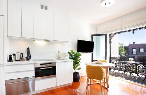 This lovely studio in the central neighbourhood of Glebe is perfect for travellers who wish to be close to the city, Ultimo, Sydney University and Royal Prince Alfred Hospital. Only a 20-minute bus trip from the CBD, it’s close to dozens of dining, drinking and café options. The studio is one of a number in a renovated Victorian building, and features a charming balcony framed in wrought iron. Everything inside is clean, functional and brand-new, including the appliances, furniture and laundry.