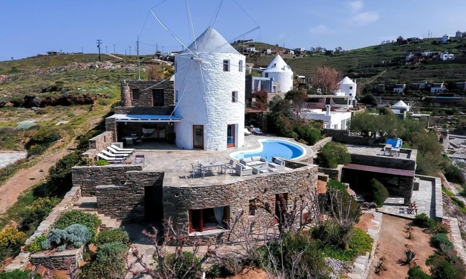 The beautiful terraced property Anemos with a magnificent view is located directly above the sea in the south of the Cyclades Island Kea. The property consists of a refurbished mill with one main building, two separate guest houses and a pool. The great location of the property directly at the sea, the tasteful interior and the beautifully designed outdoor area with several terraces provide a unique ambience for your holiday.