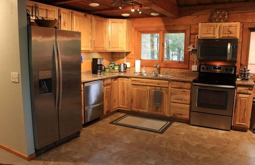 Relax with all the comforts of home in our beautiful and cozy log cabin. The Crystal Mountain Cabin comfortably accommodates 6 guests (or up to eight with the twin beds, for a small additional fee). This lovely cabin is a great place to get away for couples, families and friends. The large open floor plan has a great room feel downstairs with one bedroom and full bathroom. The 3/4 loft has 2 queen sized beds and is separated by a large ceiling height partition. There is a small bathroom in the loft.