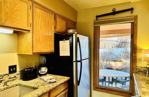 Stay connected with fast WiFi. The back yard has a table with 4 chairs to enjoy a glass of wine or cup of coffee. (Keurig and brewed coffee pot available.) Open off street parking. Choose either the ramp or the stairs from the parking lot to the condo for easy access. Close to Sprouts supermarket and Starbucks. Walk up the road to a fabulous New Mexican restaurant with wonderful views and delicious margaritas!!
