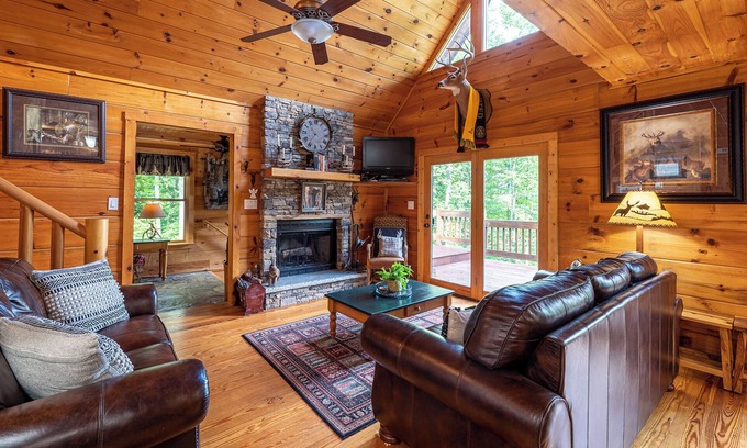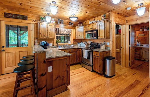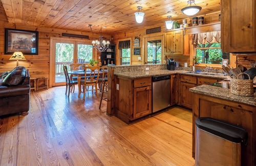 This charming cabin features four beautifully appointed bedrooms, three full bathrooms, and an open floor plan that invites comfort and relaxation. The fully equipped kitchen boasts granite countertops and modern appliances, making meal preparation a delight. Gather around the wood-burning fireplace in the cozy living area or step outside onto the oversized wrap-around deck, where outdoor dining and entertainment await. With amenities like flat-screen TVs, complimentary WiFi, central heating and air conditioning, and a game area on the lower level, your stay promises to be filled with fun and comfort. Plus, a dedicated outdoor grill area is perfect for family cookouts under the stars.