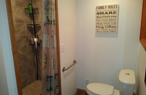 300 sq ft living quarters including the the full private bathroom that is totally private in the main house the two separate entrances overlooking our lake with lighted fountains that fishing is permitted on 20 acres to walk hike & explore.has plenty of parking with enough room to park your boat trailer or rv.this addition is brand new & been completely upgraded with all new windows and doors.The bathroom has all new fixtures with new hot water heater.