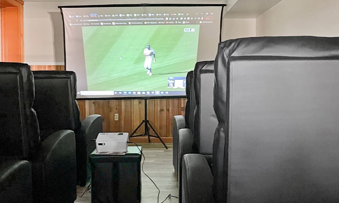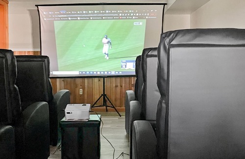 The large entertainment space downstairs includes a pool table, a card table with poker chips, and a dartboard. It also includes a 100-inch movie projection screen with six reclining chairs, perfect for movie and game nights!