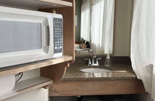 You're in the middle of the fun and yet above it all at Taos Ski Valley. Comfort, convenience and great views from this 4th floor condo consisting of two adjoined King studio condos, each with one bath, one with kitchenette and extra sleeping space on a full futon. Guests love coming in off the slopes, a three minute walk from the condo, taking boots off inside the convenient ground floor skiers entrance, putting skis in the designated ski locker and walking up to the room to relax and unwind. Perfectly appointed with comfortable beds, chairs and cafe seating, coffee service and a stocked kitchen, you'll feel right at home at our mountain.
