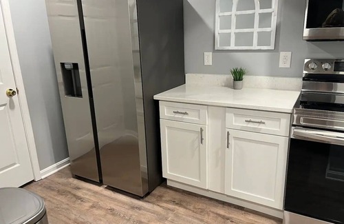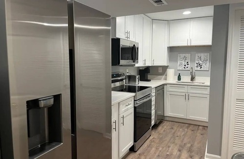 Welcome to our newly renovated basement apartment that has a separate double-door entrance with amenities for self check-in 24/7. There is a fully equipped kitchen for a short or long term stay with a refrigerator, stove, microwave, dishwasher, toaster, and coffee pot. The basement apartment has two bedrooms, one bathroom, full kitchen, living room, dining room, and laundry room. The master bedroom has a king bed while the second bedroom has a queen bed. (The owners live on the top two floors).