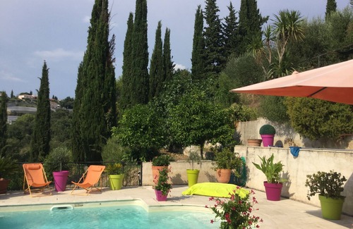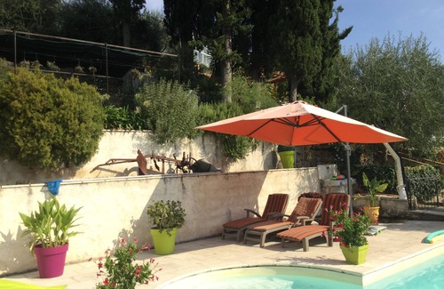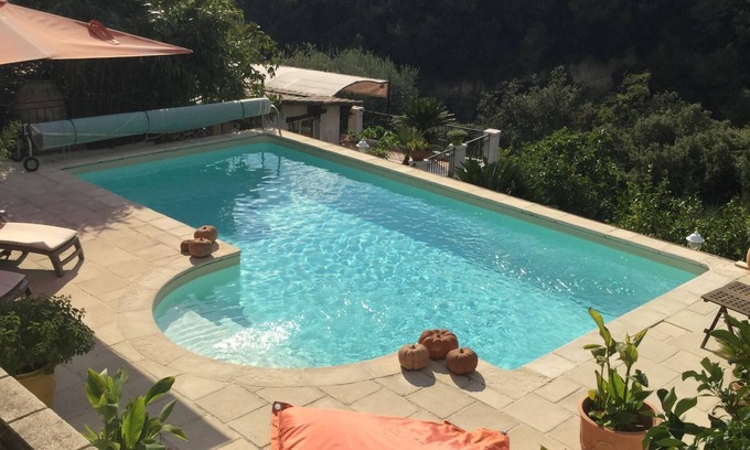 Nestled in a green setting, our bungalow is very luminous due to its south-west exposure. It is located in a large property with trees, especially olive trees and Mediterranean plants; the house is located at the end of the propriety. Self-catering, single storey, and cannot be overlooked from the outside. Furnished with style, the antique furniture is functional for the pleasure and the comfort of our guests who can also enjoy the equipped kitchen. There are two large terraces, one is equipped for relaxation and idleness, the other for a barbecue evening to enjoy your holidays. At happy hour, you may prefer to stay by the pool and relax in the serenity of the place. There is nothing you have to worry about. There is parking on the property. In 10 minutes, you can reach the tram station (parking is free of charge all day long) and the A8 motorway toward Antibes, Cannes Saint-Tropez, Monaco, Montecarlo, and Menton on one side, and Italy on the other. If you do not have a car, you can take the bus 2 minutes away from the property. You must know that in summer, in the Riviera many entertainment activities are held.