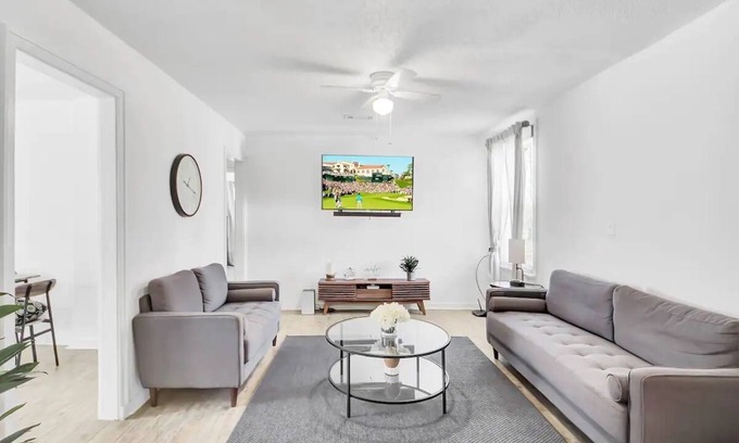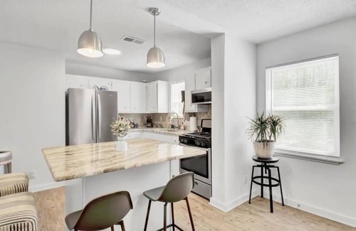 Fully appointed kitchen with appliances, including stove, oven, refrigerator, dishwasher, and microwave. Bedrooms are comfortably furnished with beautiful crisp new linens, pillows, and bed coverings. Spacious living room includes comfy sofa, 60" Smart HDTV, private backyard with patio and outdoor furniture, free high-speed Wi-Fi, onsite parking, and keyless access.