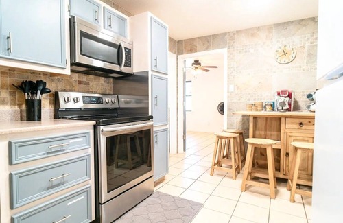 Recently upgraded and beautifully furnished throughout, this private three bedroom home features an open floor plan, full kitchen, counter-height seating, dining area, dedicated work space, and living room with 50” Smart TV.