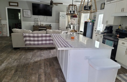 Waterfront 2 story house on a dead end street plenty of peace and privacy 2 story deck with boat slip, kayaks, a peddleboat and plenty of room for fun for the whole family. Has a separate living room king bedroom and bath upstairs and full and twin bunks and a crib in the second bedroom downstairs and of course a king bed master bedroom. Patio with sitting areas and the perfect sunset.sleeps 8 comfortably but also has a self inflating blow up queen mattress for a added extra. Dining table sits 7 and there is a highchair and a travel playpen! Granite counters and tile floors. Farmhouse decor ! This is my home and I love it !!