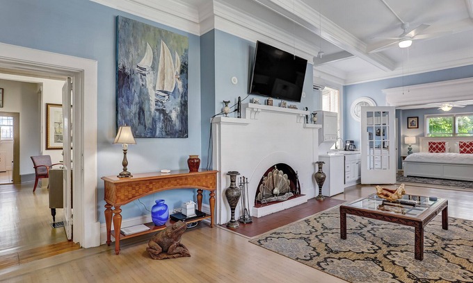 Drayton Place 1A & 1B are set in one of the most stunning Savannah vacation homes. This gorgeous brick Italianate home dates back to 1914. Delicate white columns surround the front entryway and soaring trees shade the walkways. The interior of the historic home has been renovated into modern apartments that still have plenty of antique charm.