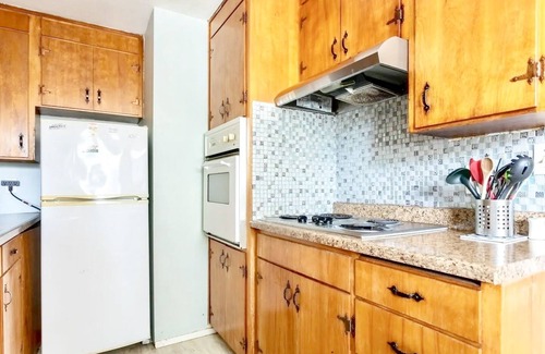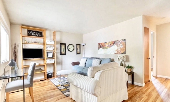 Recently upgraded and furnished throughout, this private two-bedroom apartment features an open floor plan with a full kitchen, dedicated workspace, and a living room with Smart TV.
