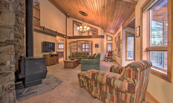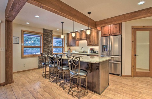 Our home is perfect for family fun, a quiet getaway or a group gathering. This home features three bedrooms, two full bathrooms, vaulted living room ceiling, a wood burning woodstove and ultramodern, well stocked kitchen with granite counter tops, two ovens and a microwave. This open concept kitchen is perfect for preparing meals for family and friends! This home features an abundance of beautiful windows which look out to the forest and has carpeting in the bedrooms for those chilly mornings. There are two queen beds and a full bathroom downstairs. Upstairs, in the loft, there are two single size beds, a bedroom with one full sized bed and the second bathroom. In addition, the couch can fold out for added space. This home can comfortably accommodate eight people with room for the kiddos and sleeping bags in the loft.